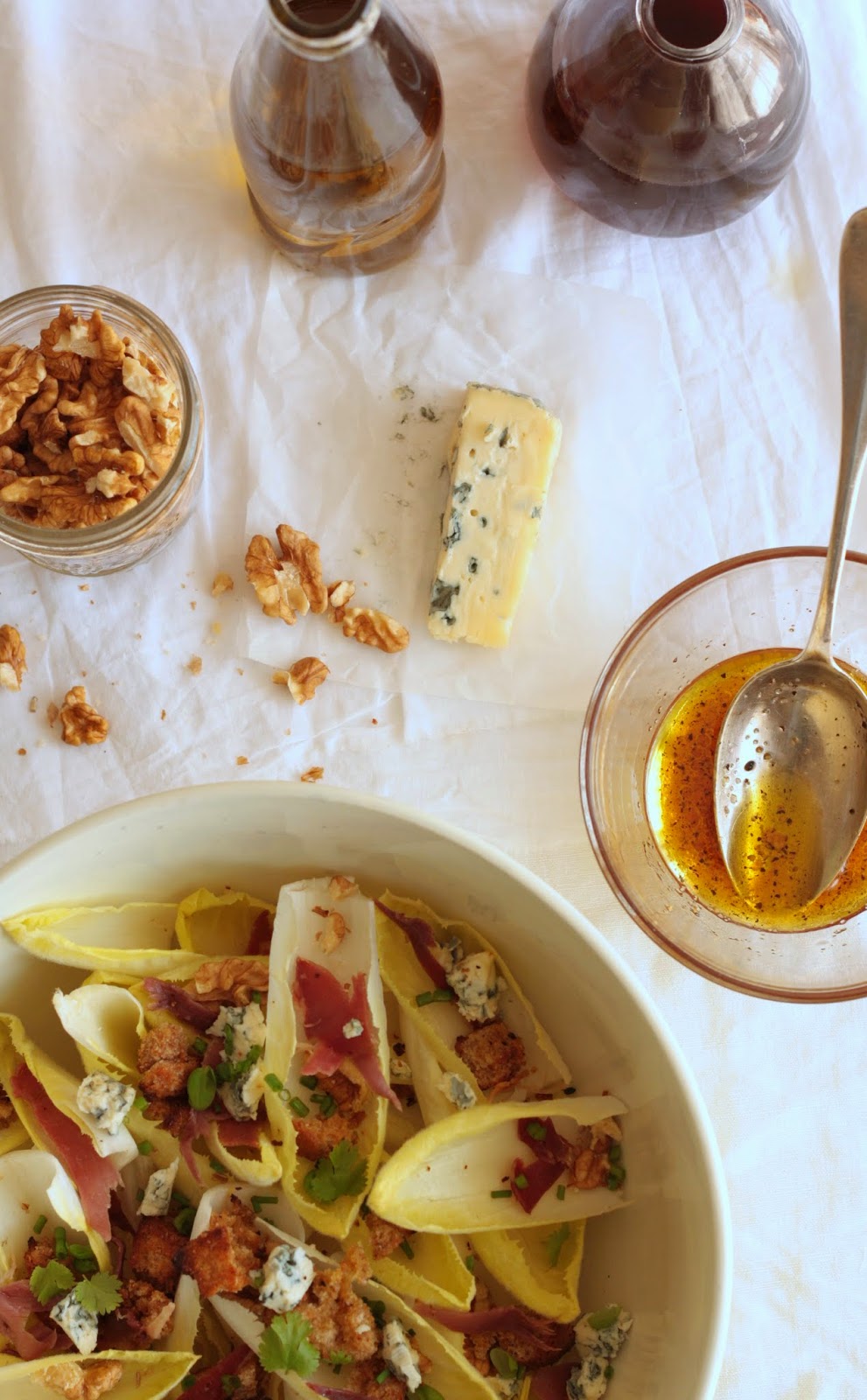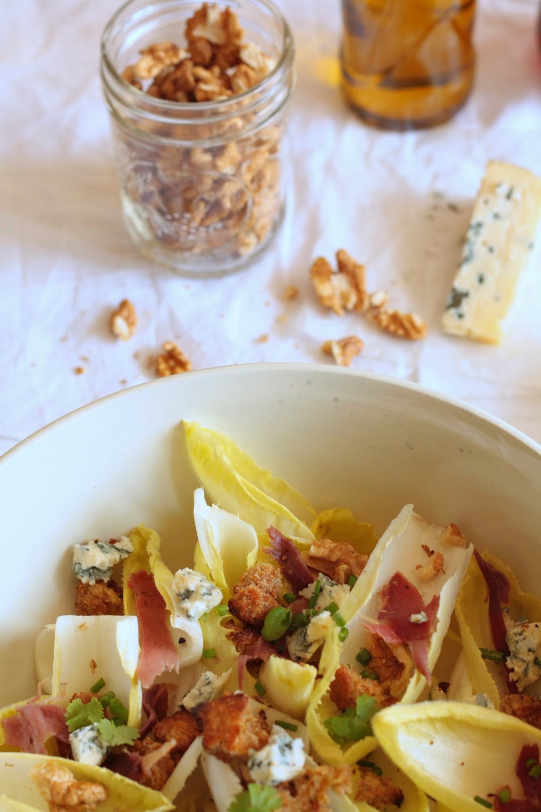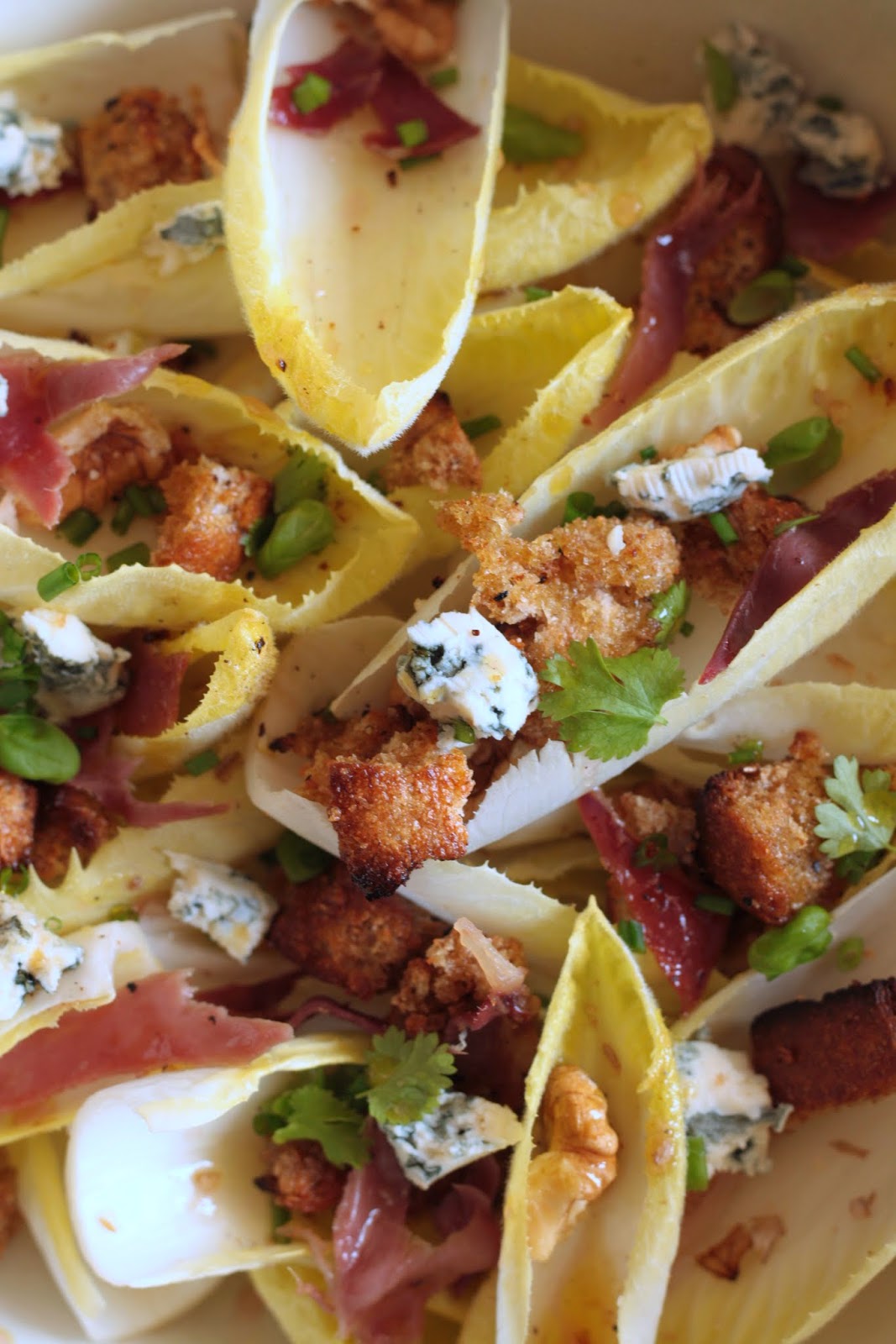 Salade d’endives aux noix, roquefort, chips de jambon, croûtons & vinaigrette au miel