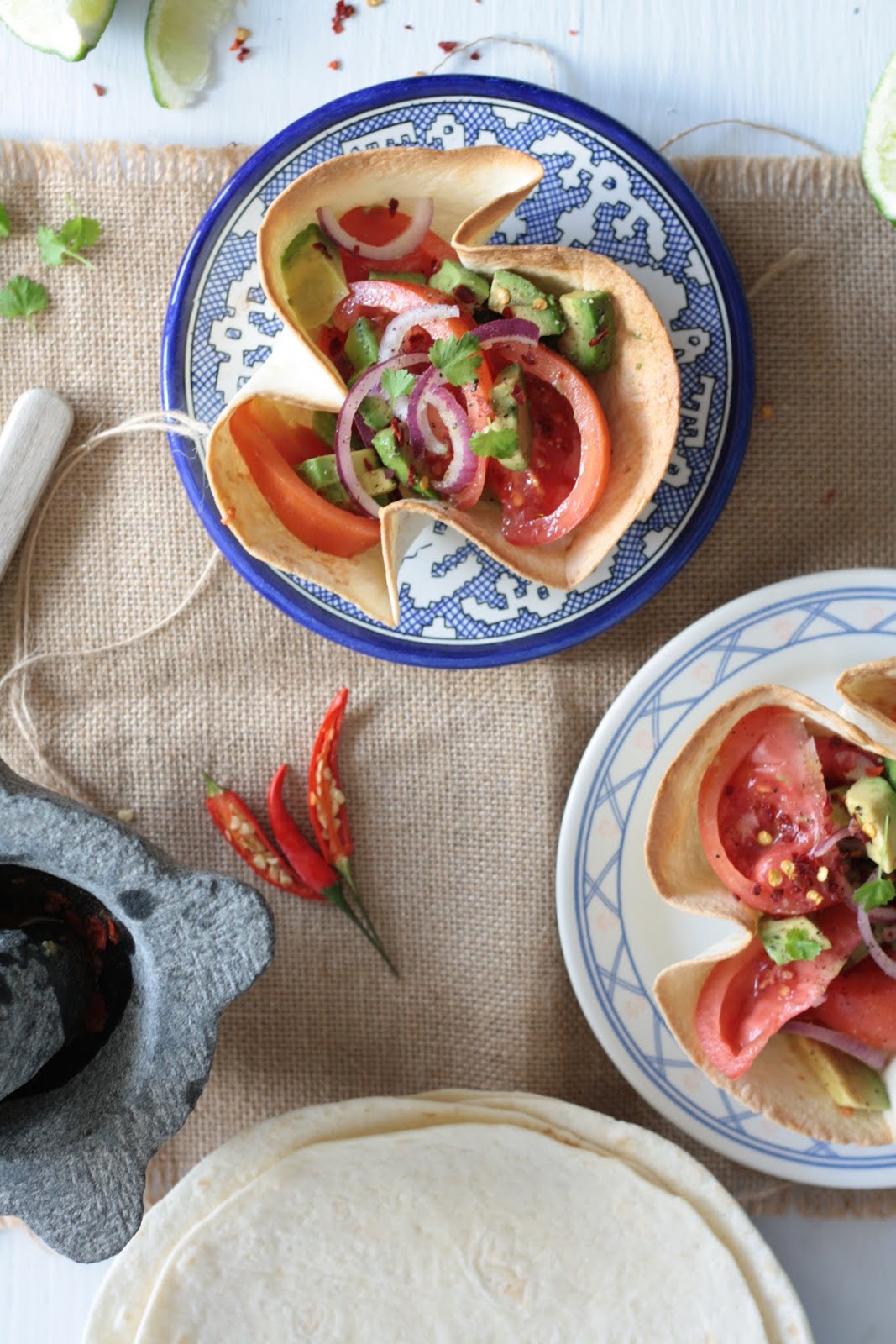 Dans un saladier, ajoutez les tomates et l’avocat découpés, l’oignon rouge émincé, la coriandre ciselée, le jus de citron vert. Versez un trait d’huile d’olive, le piment épépiné puis émincé (attention ça pique) et enfin assaisonnez en sel. Mélangez le tout avec vos mains délicatement. Remplissez les bols en tortillas de votre salade de guacamole et dégustez.