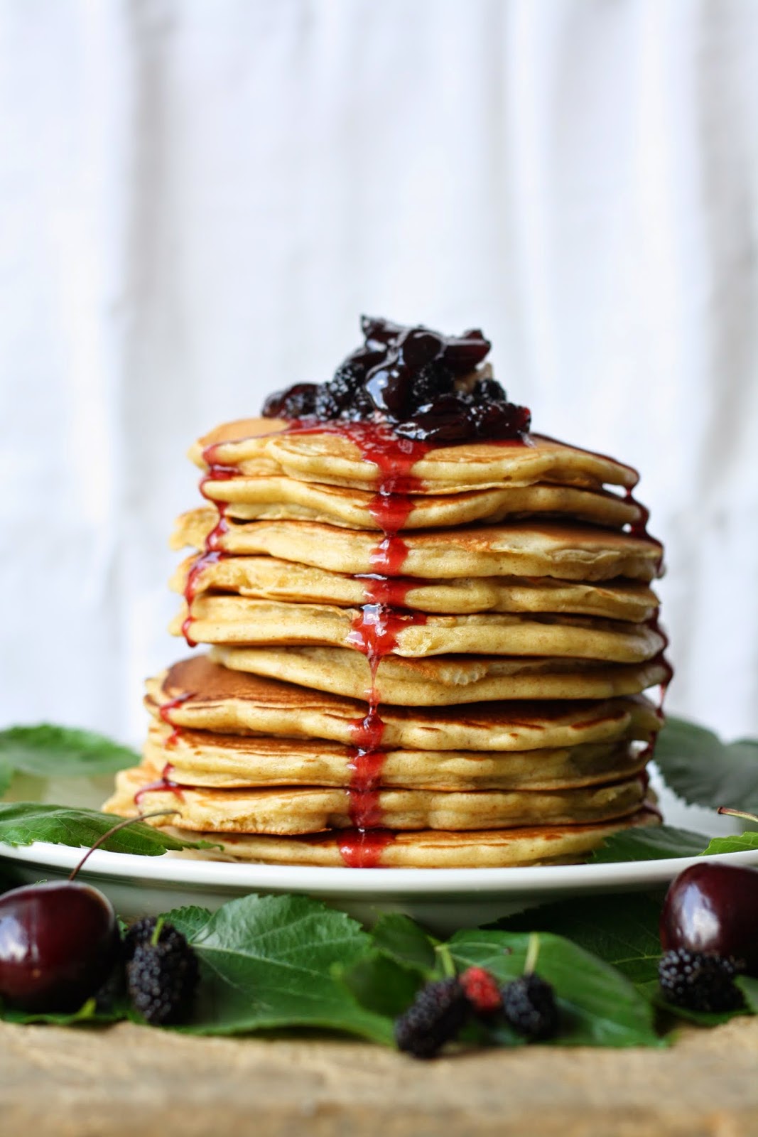 Je vous propose une recette tout spécialement pour le petit déjeuner : des pancakes au coulis de cerise minute & mûres fraîches.
